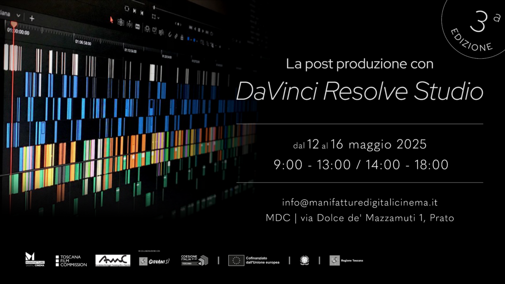 La post produzione con DaVinci Resolve Studio si svolge a MDC Prato (in via Dolce de’ Mazzamuti 1 a Prato) da lunedì 12 a venerdì 16 maggio 2025, con orario 9-13/14-18 (40 ore totali). Il corso è rivolto a figure quali: