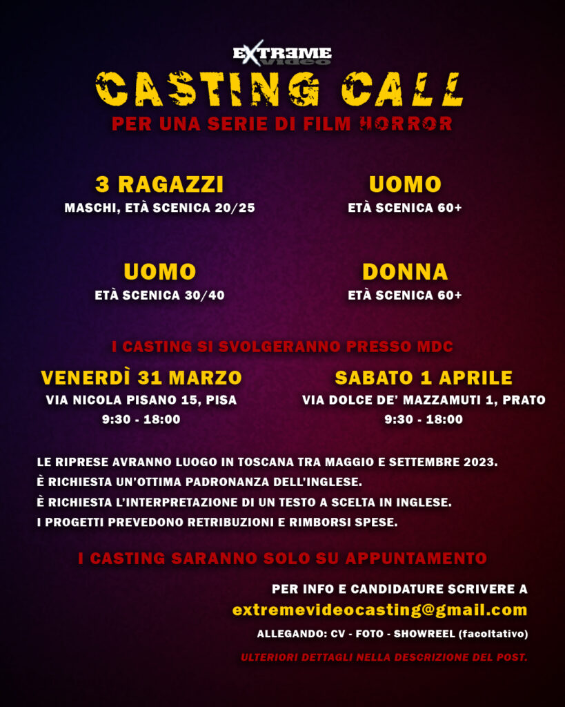 La società toscana Extreme Video cerca attori per una serie di film horror, le cui riprese saranno effettuate in Toscana tra i mesi di Maggio e Settembre 2023.