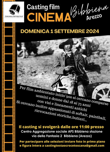 Il casting si svolgerà Domenica 1 settembre dalle ore 11 presso il Centro Aggregazione Sociale APS Bibbiena stazione, via della fantasia 2.