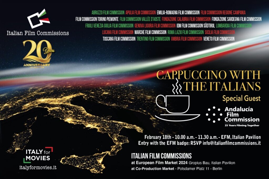 Among the initiatives we would like to point out the appointment “Cappuccino with the Italians” with all the colleagues of the Film Commissions at the Italian Pavilion on Sunday 18 February at 10 a.m.