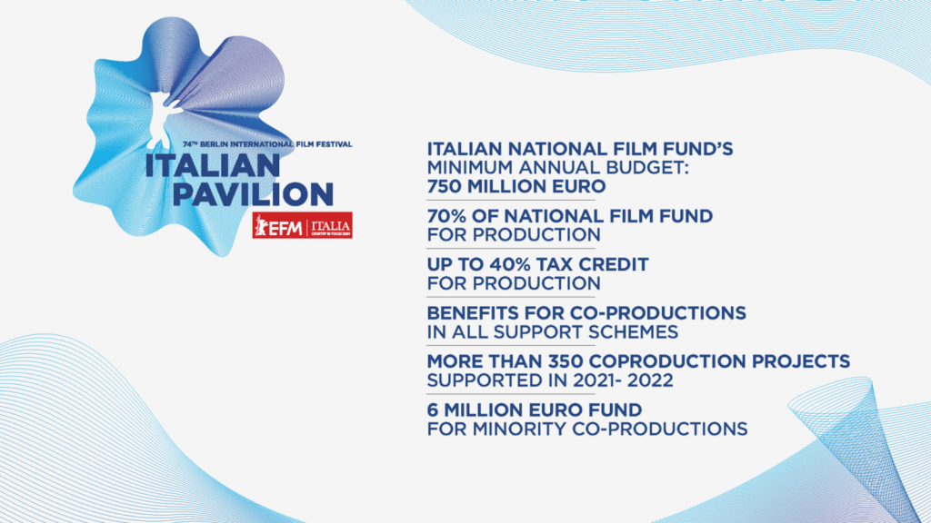 From 15 to 21 February “Italy in Focus”, in collaboration with the Italian Pavilion, will be an opportunity to promote the Italian audiovisual system, presenting new incentives, fostering co-production agreements and the development of film projects, as well as offering networking opportunities with producers, distributors, investors and creatives.